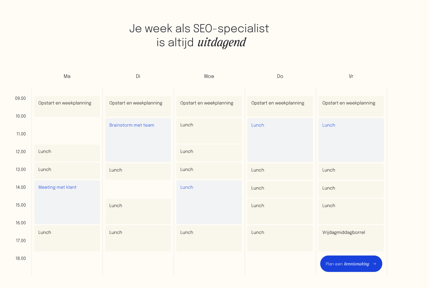 huddle 30 min - Interne meeting verbeteren workflows 1u - bi-weekly met partner 1u - advertentiecampagnes verbeteren 2u - lunchen 1u - opzetten campagnes nieuwe partner 3u - weekafsluiting & vrijmibo 1u