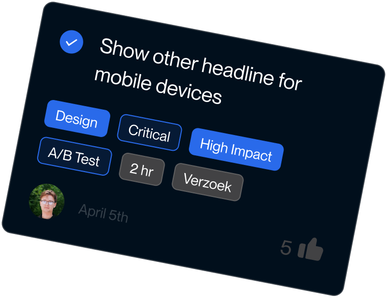 Nee. Dit is precies het probleem dat we oplossen: de "Execution Gap". Ons team ontwerpt en codeert elk experiment zelf. We pushen winnende varianten rechtstreeks naar Webflow (of je andere CMS) zonder ooit je product-backlog aan te raken of je ontwikkelingssprints te onderbreken.