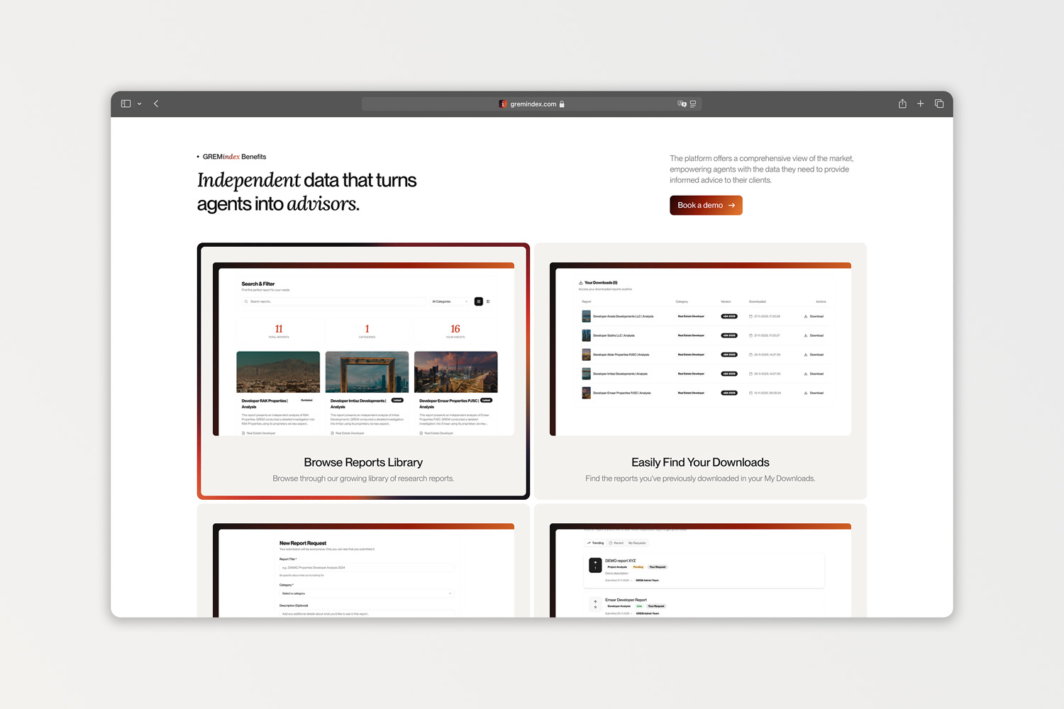 De vastgoedmarkt in Dubai is snel, maar er ontbreken vaak onafhankelijke, geverifieerde gegevens. GREM Index betrad de ruimte om deze "due diligence-kloof” op te lossen. Ze leveren onafhankelijke onderzoeksrapporten die makelaars meer dan 400 uur aan handmatig onderzoek besparen. We kregen de opdracht om het merk vanaf de basis op te bouwen en een krachtig Webflow-platform te ontwikkelen dat complexe gegevens omzet in bruikbare adviseurshulpmiddelen.