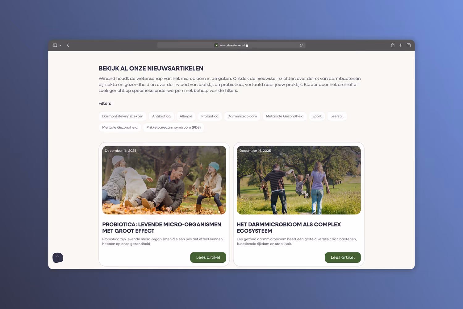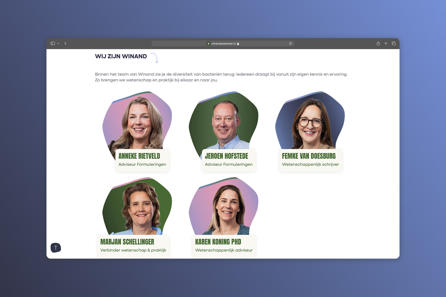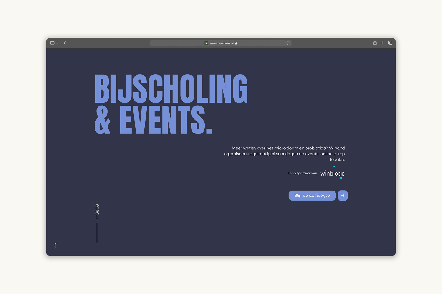 Winand (voorheen Winclove Wetenschap) is een kennisplatform dat wetenschappelijke informatie over het microbioom, probiotica en darmgezondheid toegankelijk maakt voor zowel consumenten als zorgprofessionals. Voor dit project kreeg het merk een volledig nieuwe identiteit en naam, en hebben we de website helemaal opnieuw opgebouwd. De uitdaging lag in het structureren van een grote hoeveelheid content, zodat deze voor verschillende doelgroepen duidelijk bleef en complexe wetenschappelijke informatie zowel toegankelijk als betrouwbaar werd. Winand fungeerde als een digitale gids: zonder gezicht, maar toch een betrouwbare metgezel die gebruikers door de informatie loodste.